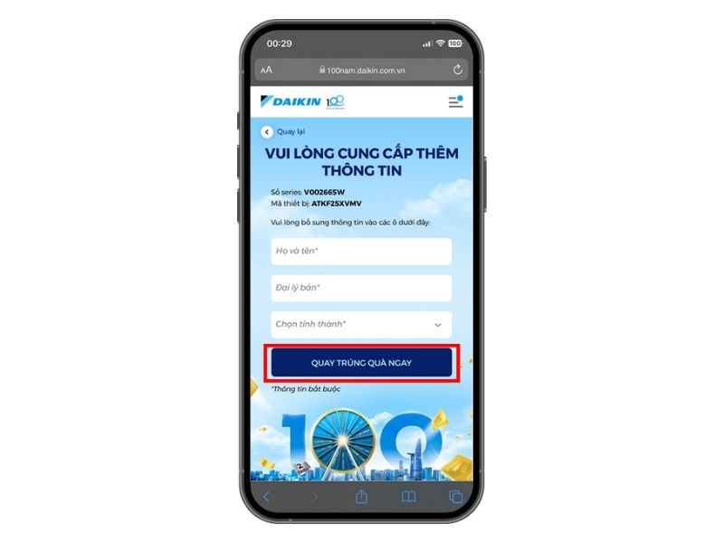 Bước 5: Khách hàng nhập thông tin mua hàng. Sau đó bấm chọn nút “Quay trúng quà ngay” để hoàn tất xác thực thông tin.