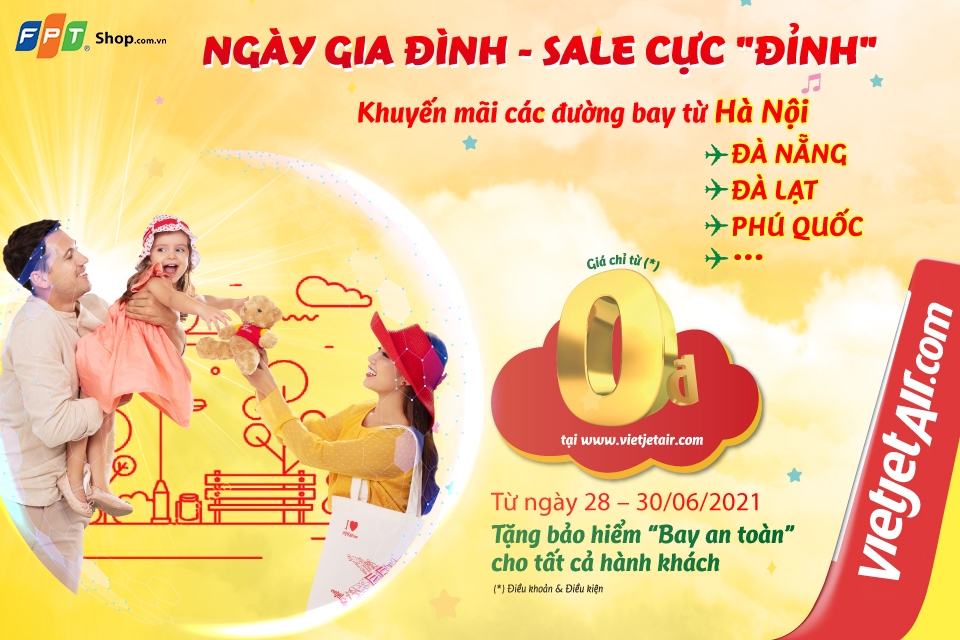 Mừng ngày Gia đình Việt Nam, FPT Shop phối hợp cùng Vietjet Air dành tặng 3 ngày vàng ưu đãi với hàng trăm ngàn vé chỉ từ 0 đồng cùng nhiều ưu đãi thiết thực khác.
