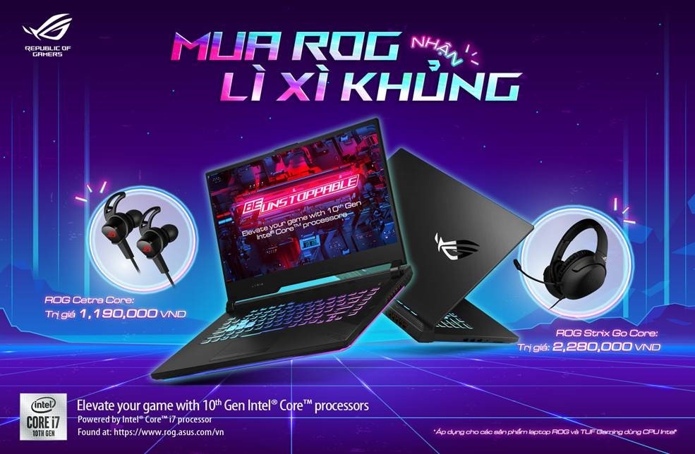 - Tai nghe ROG Strix Go Core trị giá 2.280.000 đồng dành tặng khách hàng mua laptop ASUS ROG Strix SCAR15/17 (G532/G732), Zephyrus M15 (GU502L)/ Zephyrus S15 (GX502L)/ Zephyrus S17 (GX701L) / Zephyrus Duo 15 (GX550).
