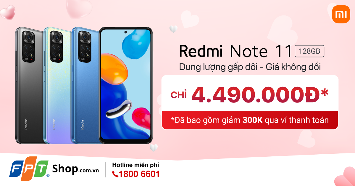 Từ ngày 11/02 đến 14/02, khách hàng mua Redmi Note 11 bản 128GB tại FPT Shop sẽ được giảm đến 500.000 đồng, giá ưu đãi chỉ 4.490.000 đồng.
