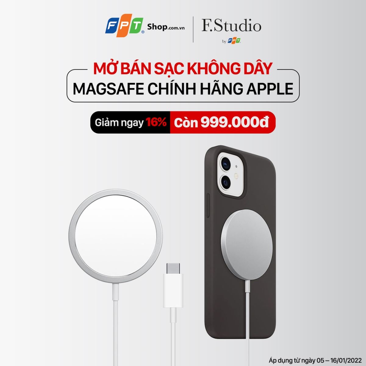 Ngày 05/01/2022, FPT Shop & F.Studio by FPT chính thức lên kệ sạc không dây Magsafe chính hãng Apple với giá ưu đãi chỉ 999.000 đồng. Đây cũng là hệ thống đầu tiên mở bán Magsafe chính hãng, đáp ứng nhu cầu rất lớn của người dùng Việt sau 1 năm dài chờ đợi.