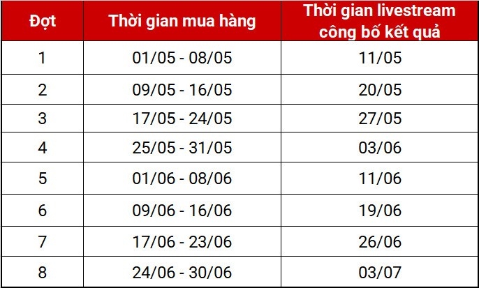 - Quay số và công bố kết quả sẽ diễn ra theo hình thức livestream trên fanpage chính thức của FPT Shop theo mốc thời gian sau: