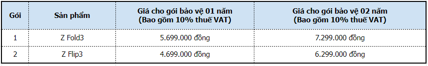 Biểu phí gói Samsung Care+ dành cho Samsung Galaxy Z Fold3 5G, Galaxy Z Flip3 5G.