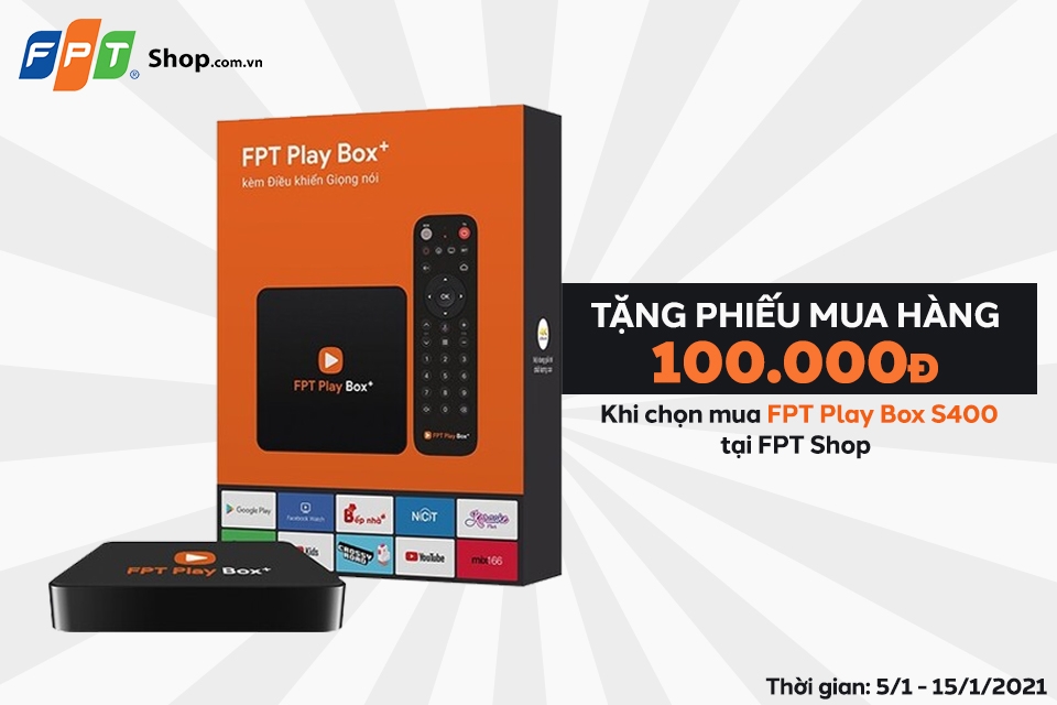 Từ hôm nay đến 15/01, khách hàng sẽ được tặng phiếu mua hàng trị giá 100.000 đồng khi chọn mua FPT Play Box S400 tại FPT Shop.