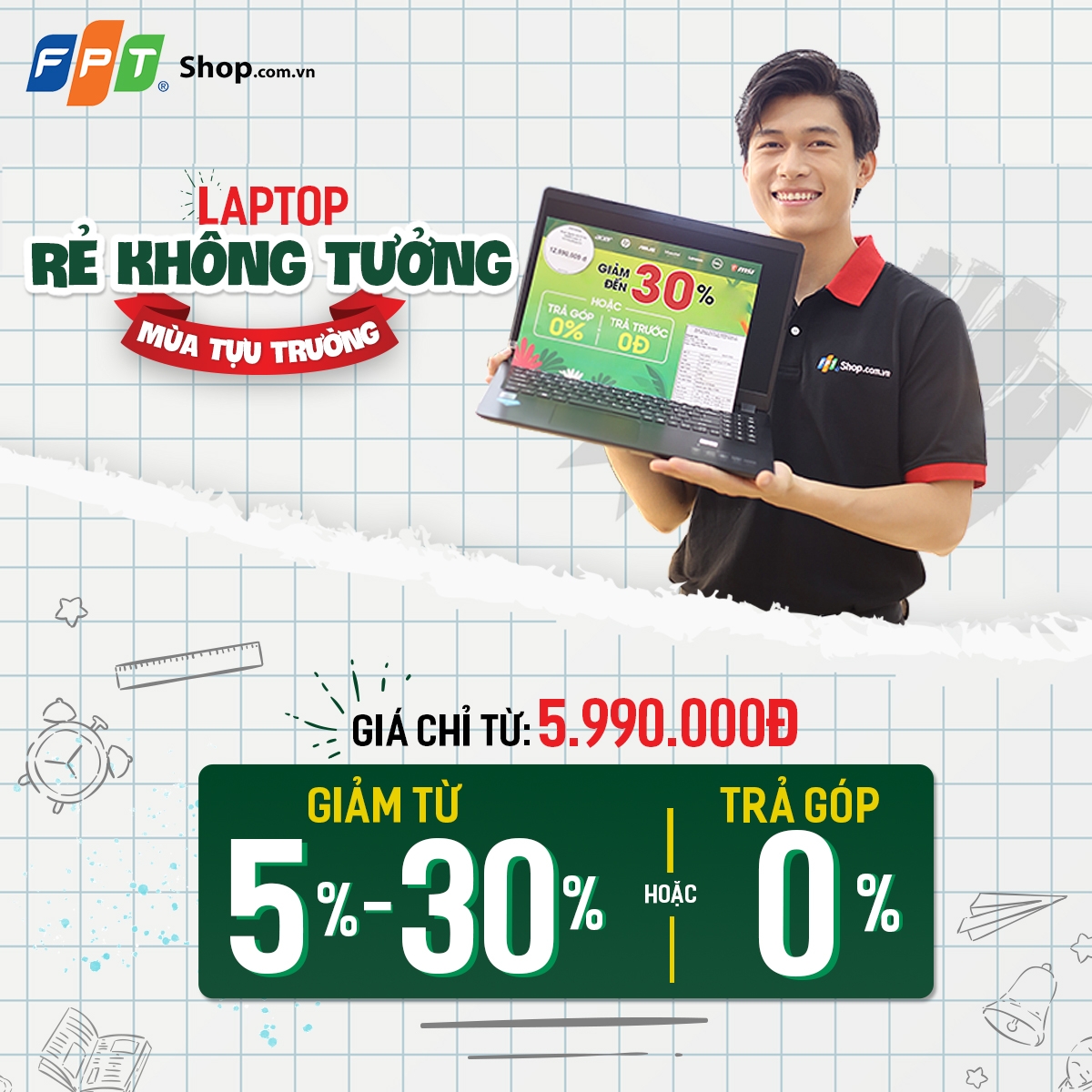 Đón mùa tựu trường, FPT Shop mạnh tay giảm từ 6% đến 30% giá laptop dành cho khách hàng chọn mua laptop từ nay đến ngày 30/11. Trong đó, những bạn là tân sinh viên 2020 (thí sinh vừa thi kỳ thi THPT 2020 vừa qua) sẽ được giảm giá đến 30%. Mức giảm giá được tính theo điểm thi trung bình của 6 môn thi như sau: 9 đến 10 sẽ được giảm ngay 30%; điểm thi trung bình dưới 6, từ 6 đến dưới 7, từ 7 đến dưới 8, từ 8 đến dưới 9 sẽ được giảm lần lượt là 6%, 7%, 8% và 10%. Những bạn không thi đủ 6 môn, xét tuyển đại học bằng học bạ hoặc tham gia kỳ thi riêng của trường… sẽ được giảm ngay 6% cho trả thẳng hoặc được trả góp 0% lãi suất, không cần trả trước.