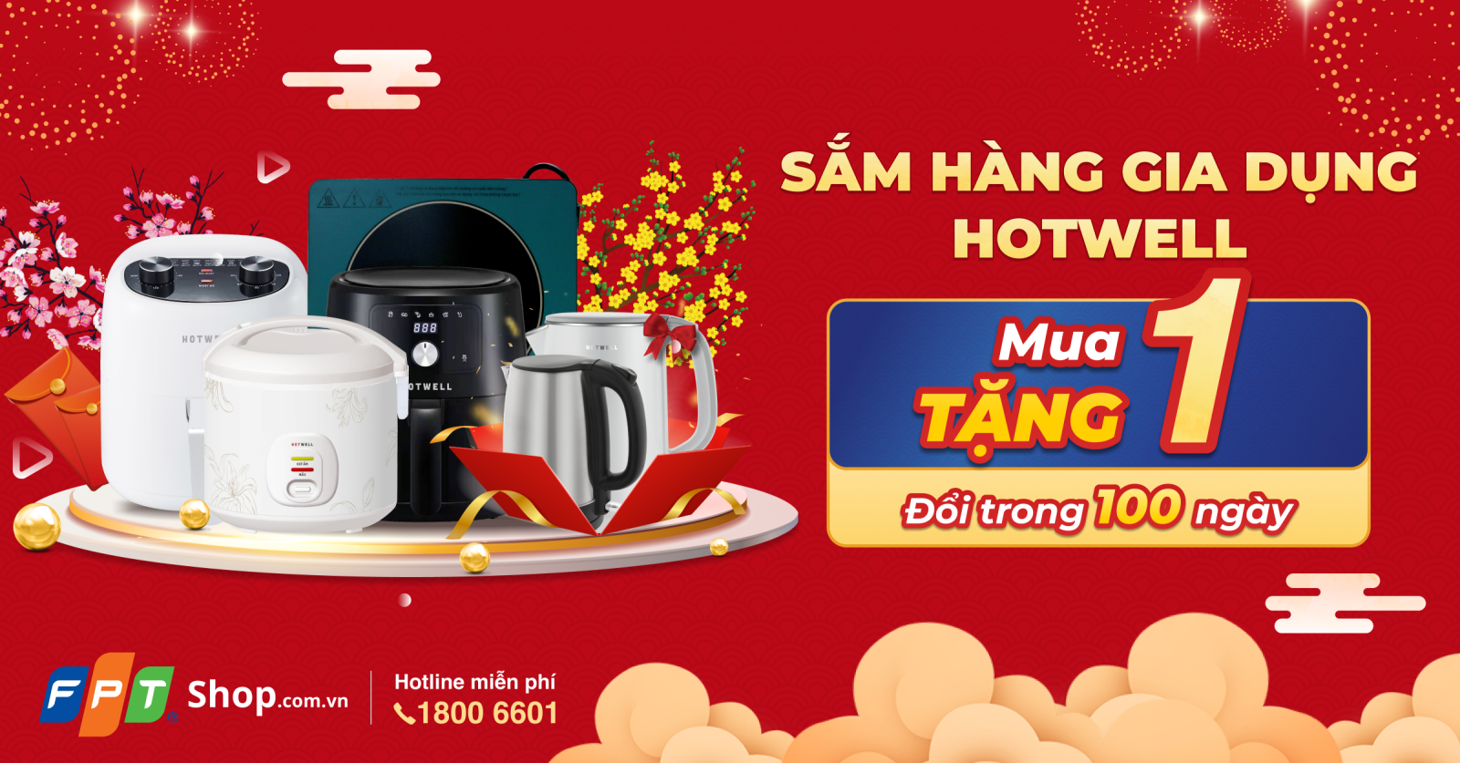 Từ ngày 01/01 - 28/02, FPT Shop ưu đãi mua 1 tặng 1 và đổi mới trong 100 ngày cho các thiết bị gia dụng Hotwell.