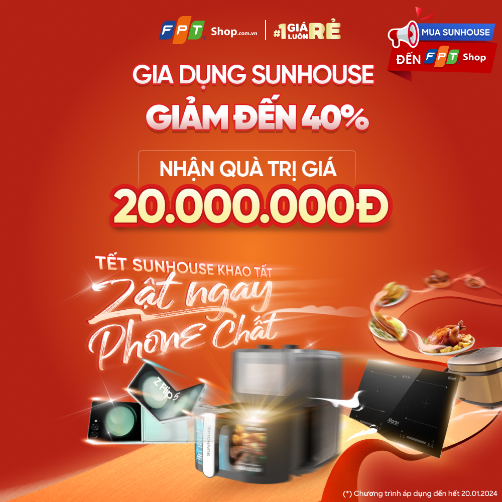 Từ ngày 01/12/2023 - 20/01/2024, Sunhouse kết hợp cùng FPT Shop tổ chức chương trình “Tết Sunhouse Khao Tất – Zật Ngay Phone Chất” với hàng chục giải thưởng có tổng giá trị lên đến hơn 100.000.000 đồng. Theo đó, khách hàng chỉ cần mua 01 sản phẩm Sunhouse bất kỳ có giá trên 500.000 đồng tại hệ thống FPT Shop toàn quốc là sẽ có ngay cơ hội tham gia chương trình với các giải thưởng hấp dẫn: