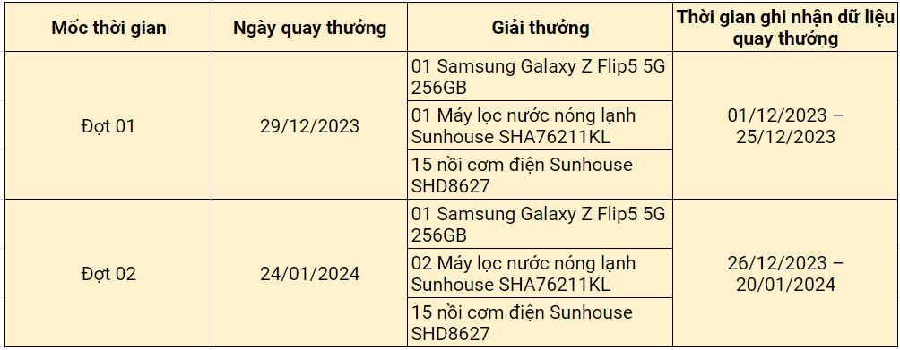- 30 giải nồi cơm điện: Mỗi giải 01 nồi cơm điện Sunhouse SHD8627 với tổng trị giá đến 34.500.000 đồng.