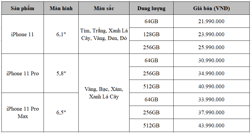 Bộ 3 sản phẩm iPhone mới chính hãng sẽ có các mức dung lượng: 64GB, 128GB, 256GB và 512GB. Về màu sắc, iPhone 11 Pro và 11 Pro Max sẽ có 4 màu trên mặt lưng nhám: Vàng, Bạc, Xám, Xanh Lá Cây. Riêng với iPhone 11, Apple đã ưu ái trang bị 6 màu trẻ trung trên mặt kính: Tím, Trắng, Xanh Lá Cây, Vàng, Đen và Đỏ. Giá của từng sản phẩm cụ thể như sau: