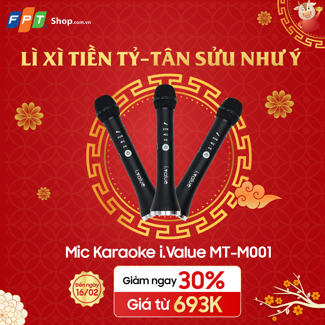 Trong bối cảnh xã hội hạn chế ra đường và tụ tập đông người thì việc hát karaoke tại gia được xem là phương pháp giải trí lành mạnh, nhất là trong dịp Tết Nguyên đán Tân Sửu sắp đến. Nhưng thay vì tìm kiếm một dàn âm thanh chuyên nghiệp phức tạp và đắt đỏ thì giải pháp tốt nhất là bạn nên sở hữu ngay một chiếc Micro karaoke i.Value MT-M001. Với thiết kế gọn nhẹ, tích hợp công nghệ bluetooth tương thích với hầu hết điện thoại, laptop cùng viên pin 2.000mAh, Micro MT-M001 phù hợp để bạn ca hát liên tục từ 4 đến 5 giờ đồng hồ và linh hoạt mọi lúc mọi nơi. Đặc biệt, sản phẩm đang được giảm ngay 30% từ nay - 16/02 tại FPT Shop, giá bán mới chỉ còn 693.000 đồng.