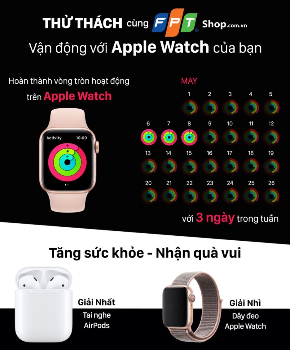 Từ ngày 6 - 12/5, FPT Shop tổ chức minigame "Thử thách cùng FPT Shop, vận động với Apple Watch của bạn" với phần quà cực hấp dẫn: tai nghe AirPods và dây đeo Apple Watch chính hãng mới 100%. Chương trình dành cho tất cả các bạn đang sử dụng Apple Watch trên khắp cả nước (không phân biệt dòng sản phẩm nào, mua tại đâu).