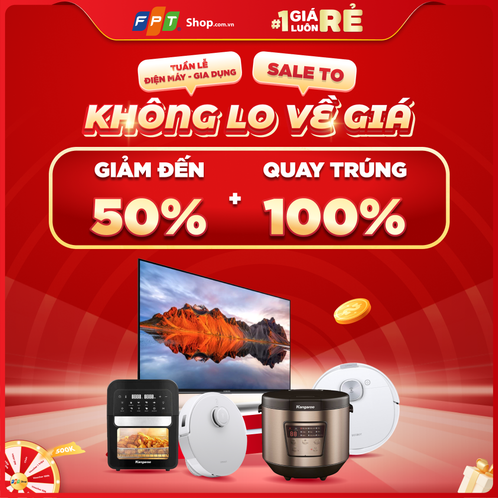 Trong Tuần lễ Điện Máy - Gia Dụng, ngoài các ưu đãi giảm “sốc” đến 50%, FPT Shop còn khởi động chương trình “Vòng quay may mắn - 100% trúng quà” với giá trị lên đến 1.000.000 đồng.