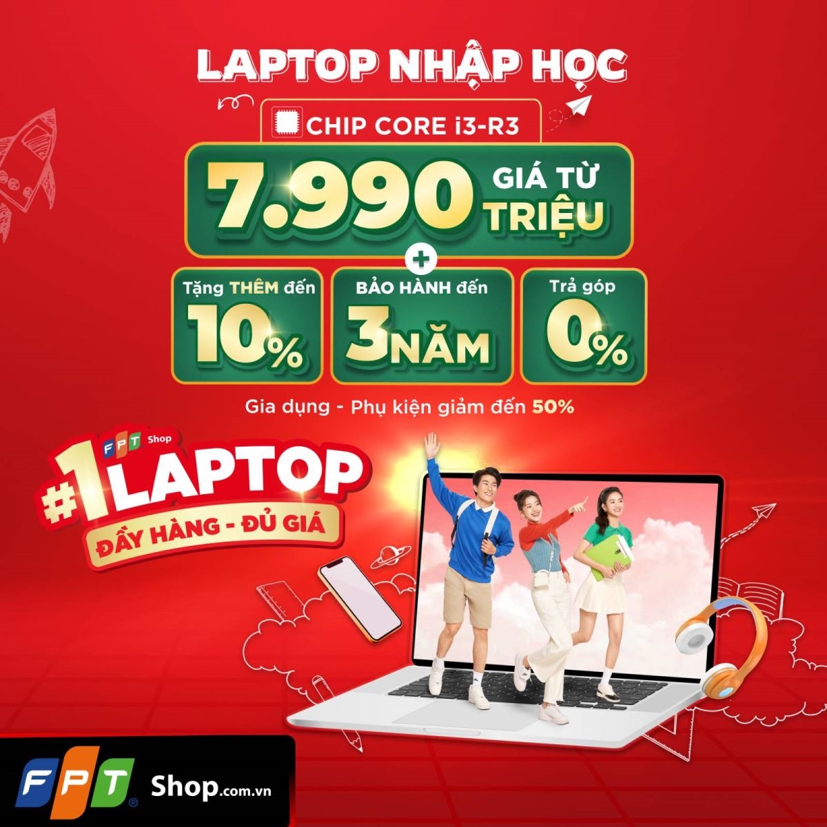 Từ ngày 01/07 - 31/10/2023, khách hàng là học sinh, sinh viên khi mua laptop, PC hoặc LCD tại FPT Shop sẽ được nhận các ưu đãi hấp dẫn như: Giảm đến 15.000.000 đồng, giảm thêm 3%, tặng thêm 01 năm bảo hành cùng nhiều phần quà thiết thực khác.