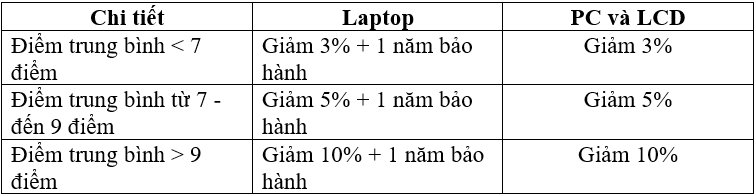 - Khi mua laptop, PC hoặc LCD: Giảm thêm 3%, cộng thêm 01 năm bảo hành cho laptop, nâng tổng thời gian bảo hành laptop lên đến 03 năm.