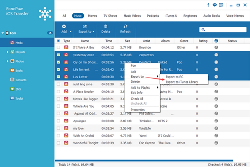 Nếu bạn thích các chức năng của iTunes thậm chí còn nhiều hơn nữa, bạn hãy thử dùng Fonepaw. Fonepaw quản lý thư viện âm nhạc của bạn và cung cấp cho bạn các tùy chọn di chuyển có chọn lọc các bài hát, danh sách nhạc giữa thiết bị dùng iOS và máy tính mà không có bất kỳ giới hạn. Chỉ với một cú nhấp chuột, bạn có thể đồng bộ hóa tất cả hoặc một phần thư viện âm nhạc, podcast, iTunes U, sách audio… và nhiều hơn nữa giữa các thiết bị của Apple và PC. Tất cả bạn cần để bắt đầu là để kết nối thiết bị của mình với máy tính và sau đấy chuyển dữ liệu mà thôi.