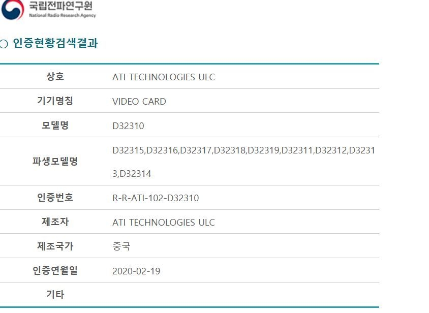 Một nhánh của các mẫu GPU thuộc AMD đã nhận được chứng chỉ RRA vào ngày 19 tháng 2 vừa qua, trong này có bao gồm GPU AMD ATI-102-D32310. Đây có thể chính là mẫu GPU AMD Radeon RX 5950 XT mà chúng ta đang mong chờ.