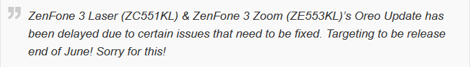 Vì lý do gặp một số vấn đề trong quá trình tinh chỉnh phiên bản Android 8.0 cho hai thiết bị Zenfone 3 Laser và Zenfone 3 Zoom, ngày ra mắt phiên bản Android 8.0 cho hai thiết bị này sẽ bị dời lại.