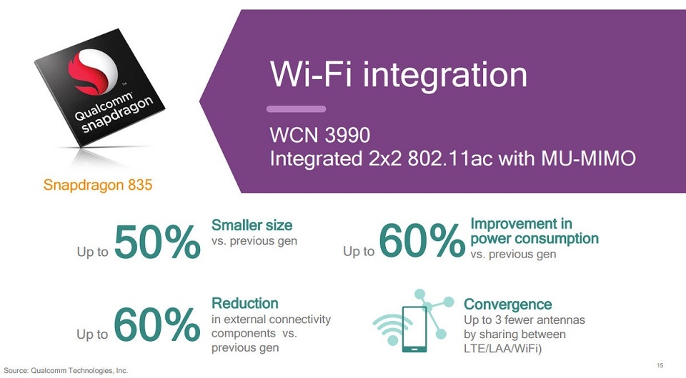 Về kết nối, con chip đời mới của Qualcomm được tích hợp modem 4G LTE Snapdragon X16, Wi-Fi 802.11ad, tất cả đều có tốc độ Gigabit, ăng-ten MIMO 4x4. Nó nhỏ hơn 45% và tiết kiệm điện hơn 60% (không rõ là tiết kiệm so với cái gì).