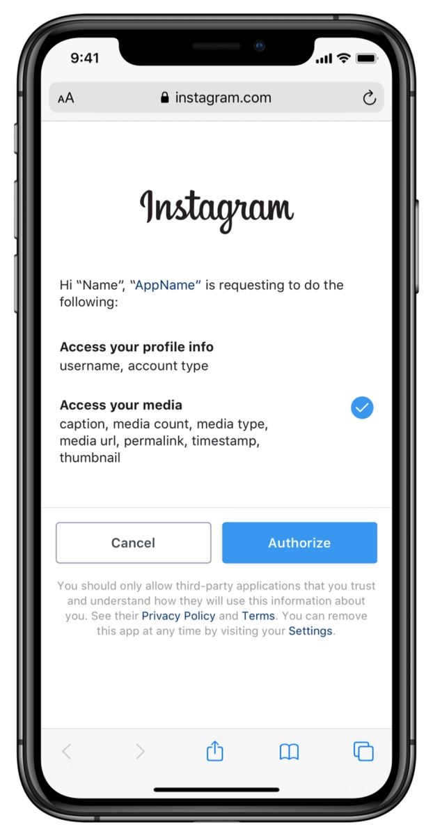 Với sự thay đổi này, Instagram đang giới thiệu các tính năng kiểm soát ứng dụng yêu cầu quyền truy cập vào tài khoản của người dùng. Lần đầu tiên bạn sử dụng một trong những ứng dụng như thế này, bạn sẽ thấy một màn hình xác thực hiển thị các thông tin mà ứng dụng này yêu cầu bạn cấp quyền.