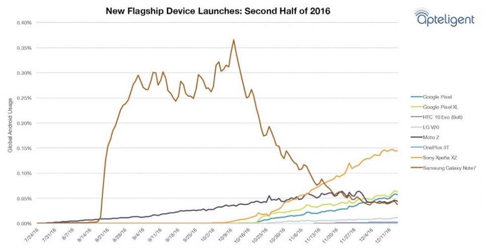 Mặc dù đã được cảnh báo về nguy cơ cháy nổ nhưng một báo cáo mới đây cho thấy Note 7 vẫn đang là thiết bị được sử dụng nhiều nhất hiện nay, cao hơn cả LG V20, OnePlus 3 và HTC Bolt cộng lại. Ba model này được phát hành vào tháng 10, tháng 11, và tháng 11 tương ứng.