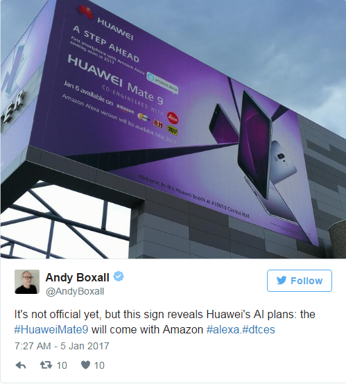 Thông in từ tấm biển cho biết Huawei Mate 9 là chiếc smartphone đầu tiên được trang bị trợ lý ảo Alexa của Amazon và máy sẽ chính thức lên kệ vào ngày 6/1 thông qua các website bán lẻ như Amazon, Best Buy, Newegg và B&H.