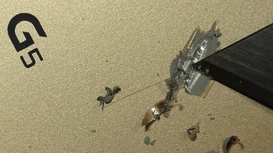 Như có thể thấy trong đoạn video bên dưới, sau khi tiến hành cạo lớp vỏ nhôm bên ngoài thì ngay bên dưới khu vực đó là một lớp bằng nhựa rất dễ bị trầy xước.