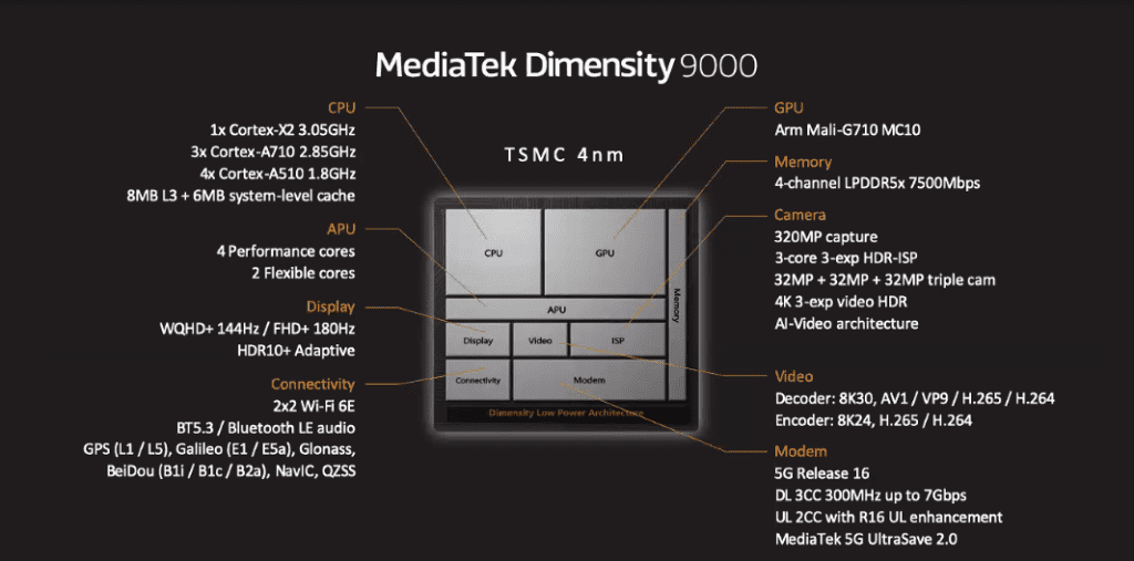 MediaTek Dimensity 9000 là vi xử lý đầu tiên trên thế giới được sản xuất tiến trình 4nm của TSMC và cũng là chipset đầu tiên sử dụng kiến trúc V9 mới của ARM.