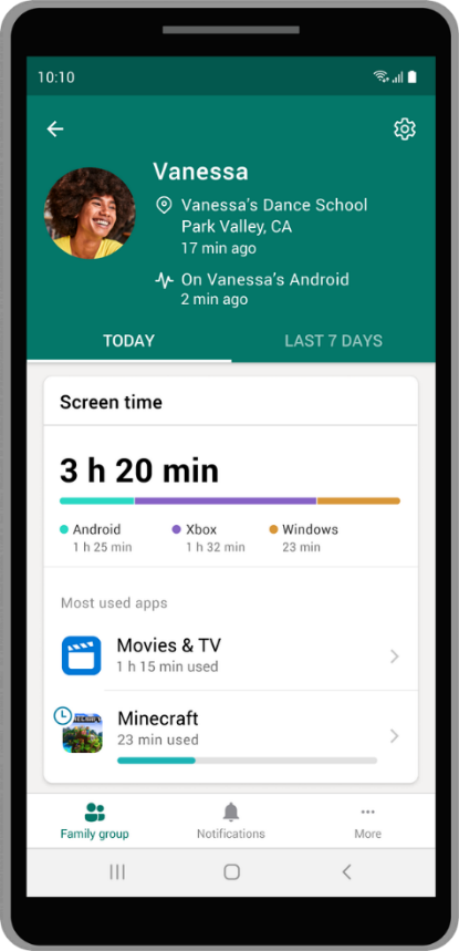 Microsoft Family Safety là một ứng dụng dành cho người dùng Microsoft 365 trên Android và iOS. Ứng dụng này sẽ quản lý thời gian bật màn hình trên PC – Android – Xbox, đồng thời nó còn có thể chia sẻ địa điểm và thông báo khi một người trong gia đình đến nơi hoặc có mặt ở các địa điểm như nhà – trường học – nơi làm việc. Thông tin về những thành viên đó sẽ được cập nhật liên tục.