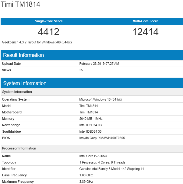 Theo đó, laptop Xiaomi mới có số model là Tim TM1814 và Roland Quandt cho rằng đây là một chiếc Mi NoteBook mới sắp ra mắt. Máy đi kèm với vi xử lý Intel Core i5-8265U, đây là vi xử lý mới của Intel. Ngoài ra, laptop này cũng được tích hợp bộ nhớ RAM 8 GB.