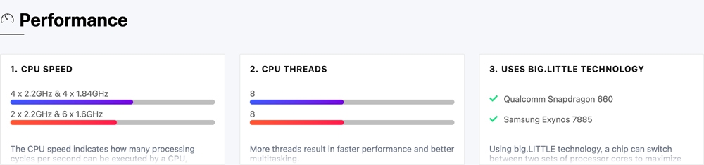 Như bạn có thể thấy thì gần như các thông số kỹ thuật của hai chip này đều tương tự nhau, ngay cả thời gian ra mắt cũng không cách nhau quá lâu. Như hai bảng dưới đây thì bạn có thể thấy thì Snapdragon 660 có hiệu suất CPU cao hơn, phiên bản Direct X cao hơn, thế nhưng, Exynos 7885 lại có tốc độ GPU cao hơn.