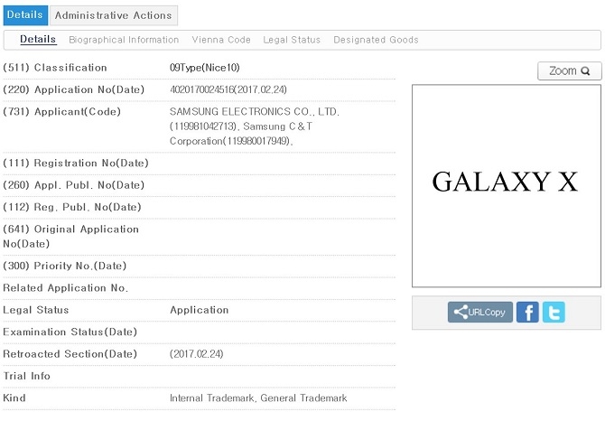 Theo thông tin từ Cục Thông tin bản quyền sở hữu trí tuệ Hàn Quốc, Samsung Galaxy X sẽ có hai biến thể có mã hiệu là SM-X9000 và SM-X9050, tương đương với tên thương mại là Galaxy X1 và Galaxy X1+. Samsung trong những năm gần đây luôn thể hiện sự sáng tạo của mình ở lĩnh vực smartphone. Họ đã dẫn đầu xu hướng màn hình cong và sắp tới có thể sẽ là xu hướng màn hình gập. Nhiều thông tin rò rỉ cho thấy dòng smartphone màn hình gập đầu tiên trên thế giới Samsung Galaxy X sẽ ra mắt vào quý 3 năm nay, chúng ta hãy cùng chờ xem.