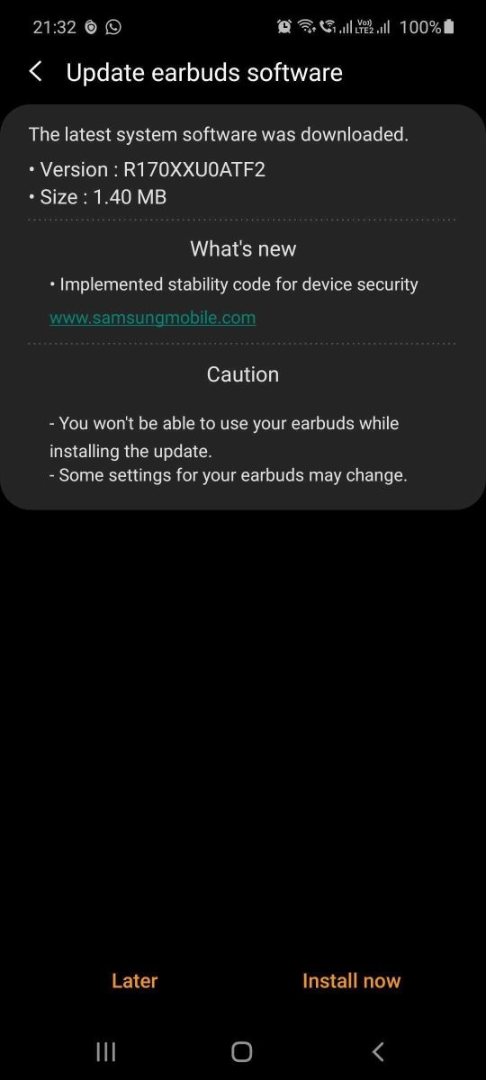 Cụ thể, phiên bản phần mềm có dung lượng 1,40 MB trên Samsung Galaxy Buds và có dung lượng 1,32 MB trên Galaxy Buds+, bao gồm tăng cường độ ổn định, bảo mật cho thiết bị, cũng như bổ sung các menu mới để chặn và quản lý kết nối với các thiết bị đã biết và chưa biết.