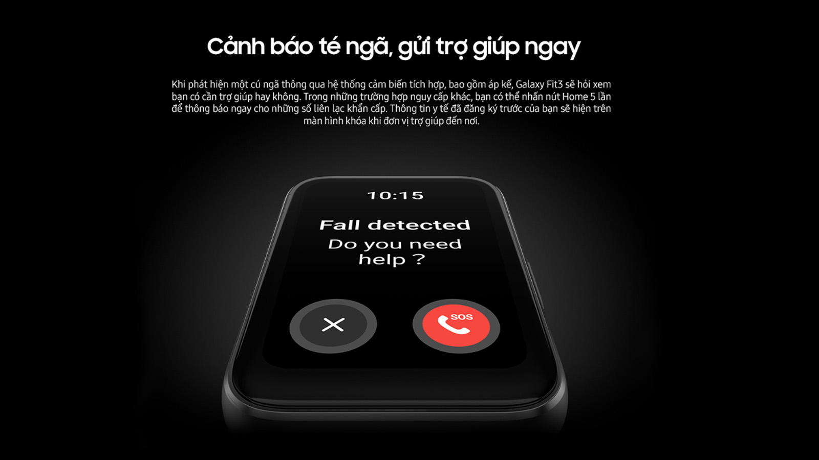 Nhằm giúp người dùng an tâm hơn, Galaxy Fit3 đã được bổ sung thêm các tính năng an toàn, bao gồm Cảnh báo té ngã và Gọi điện Khẩn cấp/Gửi SOS. Theo đó, khi thiết bị phát hiện cú ngã bất thường, sẽ lập tức cung cấp cho người dùng tùy chọn hữu ích là gọi ngay dịch vụ khẩn cấp để nhận được hỗ trợ y tế kịp thời. Đồng thời, người dùng khi rơi vào tình huống khẩn cấp cũng có thể gửi tín hiệu SOS nhanh chóng bằng cách nhấn nút bên 5 lần.
