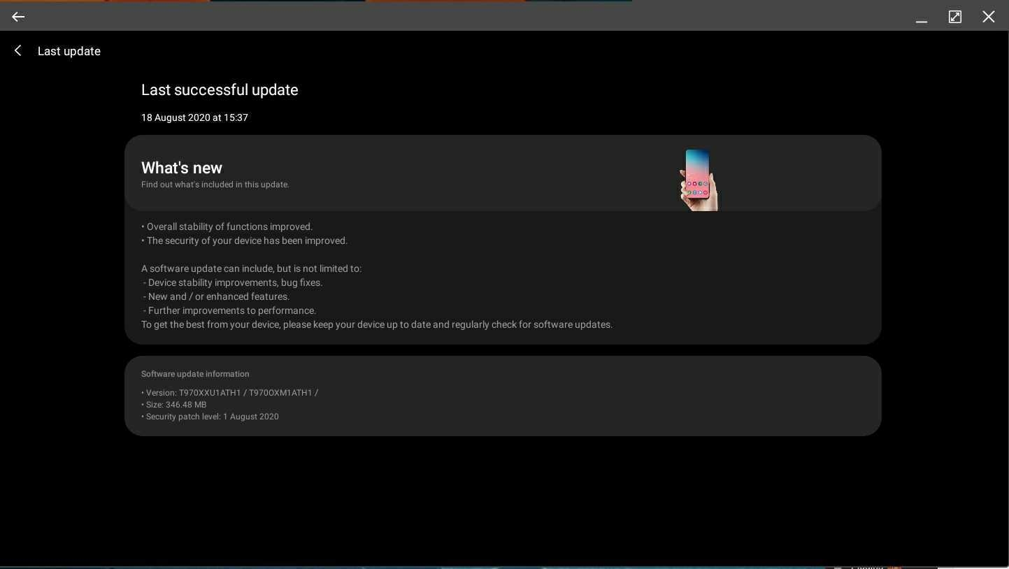 Cụ thể, phiên bản mang số hiệu T970XXU1ATH1 và có dung lượng khoảng 350MB, hiện đang phát hành cho Galaxy Tab S7, đi kèm với bản vá bảo mật Android tháng 8/2020 mới nhất.