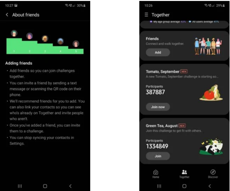 Theo đó, Samsung Health đã bổ sung mục Danh bạ trên các thiết bị Galaxy tích hợp vào phần mềm, cho phép bạn mời những người bạn tập luyện mới trực tiếp từ tab Together. Tại đây, người dùng có thể share mã QR hoặc mời bạn bè đề cùng nhau tập thể dục thông qua thiết bị Samsung Galaxy Watch 3.