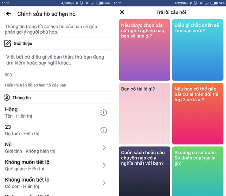 Đầu tiên để bắt đầu sử dụng các tính năng trong Hẹn hò thì bạn phải tạo hồ sơ hẹn hò. Các bước gần như rất đơn giản, chỉ cần điền một số thông tin như Giới tính, đối tượng, vị trí hình ảnh yêu thích...