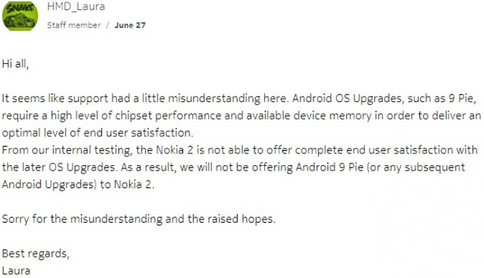 Tuy nhiên, một quản trị viên cộng đồng Nokia hiện đã xác nhận rằng bộ phận hỗ trợ khách hàng đã có một số hiểu lầm và trên thực tế, Nokia 2 sẽ không nhận được bản cập nhật Android Pie. Bạn có thể thấy điều này ở hình ảnh dưới đây.