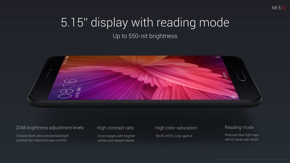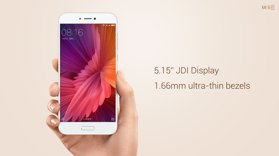 Xiaomi Mi 5c sở hữu màn hình kích thước 5,15 inch do JDI sản xuất với viền mỏng chỉ 1.66mm. Điểm đặc biệt trên màn hình này chính là nó được tích hợp thang điều chỉnh độ sáng với 2048 cấp độ, có khả năng tùy chỉnh thông minh tùy theo môi trường. Ngoài ra thì bạn cũng có thể thoải mái sử dụng thiết bị trong điều kiện nắng ngắt ngoài trời nhờ độ sáng tối đa có thể đạt đến là 550 nit.