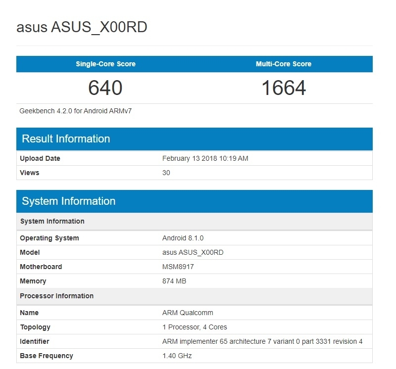 Mới đây, một thiết bị của ASUS lộ diện Geekbench và nguồn tin cho biết đây là một chiếc smartphone chạy Android Go. Cụ thể, thiết bị mang mã model ASUS X00RD, điện thoại chạy Android Go Oreo, chạy Snapdragon 425, kết hợp 1 GB RAM và hỗ trợ màn hình HD.