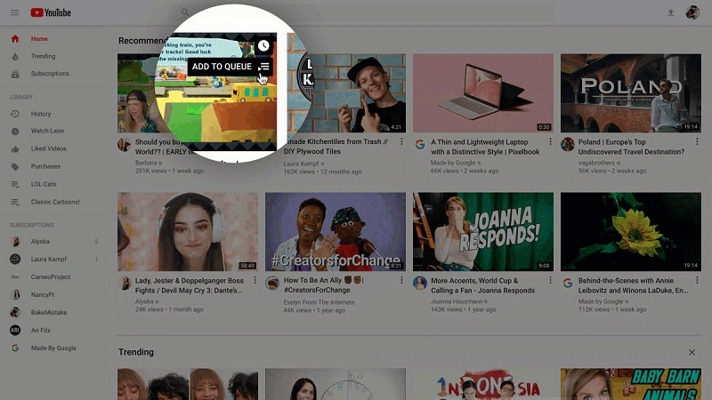 Ngoài ra, tính năng Add To Queue cũng đã có mặt trên nền desktop này. Bạn có thể thêm một video vào danh sách ưa thích của mình ngay từ ảnh thumbnail của nó mà không cần phải truy cập trực tiếp vào video đó. Nhớ là đừng đóng tab đột ngột vì làm như vậy sẽ khiến cho danh sách của bạn biến mất.